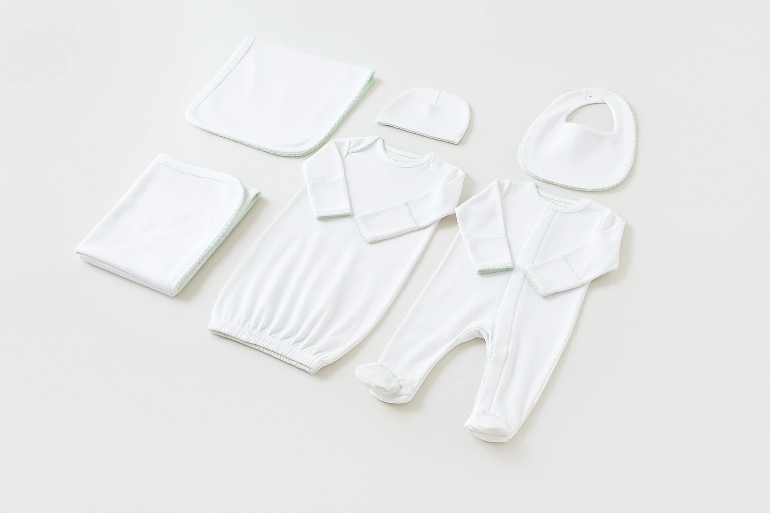 This Nola Tawk Take Me Home Set is all white with light green trim and your choice of monogram.