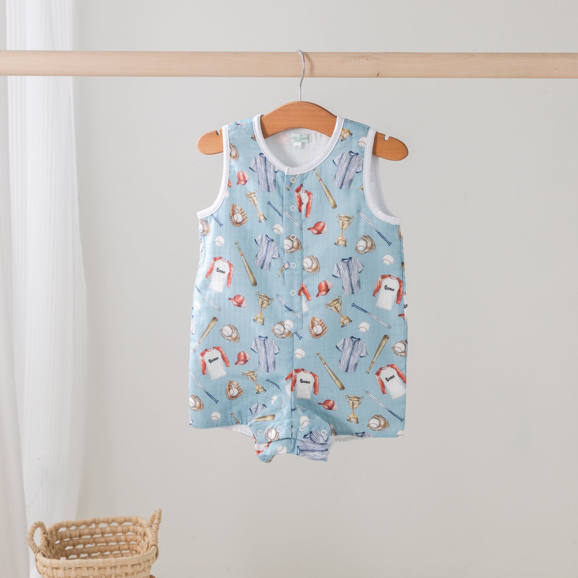 Let your baby swing for the fences in the ‘Let’s Play Ball’ Organic Muslin Shortall!